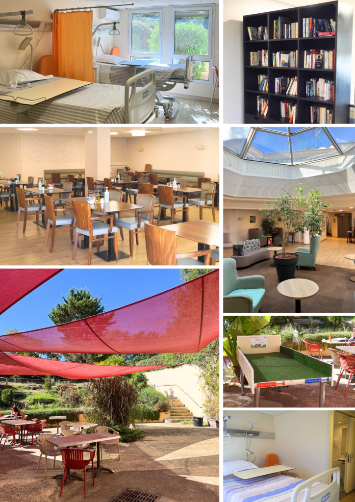 - Des espaces communs mis à disposition des patients, fonctionnels et décorés avec goût ; ainsi qu’un salon de restauration ouvert tous les jours pour recevoir des visites autour d’une collation sucrée. De quoi profiter d’une convalescence dans un cadre verdoyant et apaisant.