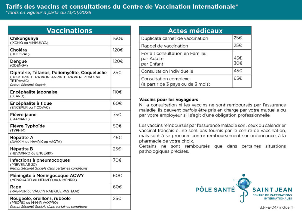 Le Centre de Vaccination Internationale du Pôle Santé Saint Jean est habilité par l’ A.R.S (Agence Régionale de Santé) à pratiquer le vaccin de la Fièvre Jaune (ou vaccin anti-amaril), vaccin indispensable pour un séjour dans une zone à risques (régions intertropicales d’Afrique et d’Amérique du Sud).